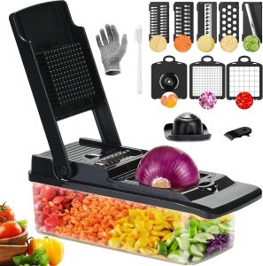 Una mandolina te ayuda a cortar verduras de manera uniforme y rápida, lo que es especialmente útil para hacer guarniciones y ensaladas. Las cuchillas intercambiables tienen diferentes formas y tamaños, te permiten cortar, cortar en cubos, rebanar, picar, juliana, picar frutas y verduras como cebolla, champiñones, pepinos, zanahorias, patatas, tomates, jengibre, ajo y más.