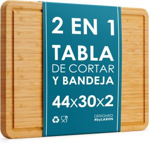 Para que no tengas que cortar sobre la encimera de la cocina, te proponemos esta exclusiva tabla de bambú reversible ha sido diseñada como tabla de cortar por un lado y como bandeja por el otro. Un diseño inteligente que permite ahorrar tiempo y espacio en la cocina. Fabricada en bambú macizo de 2 cm de espesor, esta es extremadamente resistente a las grietas, astillas y dobleces.